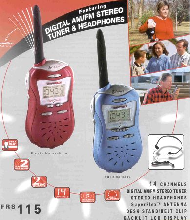 FRS Two Way communications and listen to your favorite AM or FM Stereo radio station with the stereo headset included. Digital stereo tuner has great quality sound. Permanent memory system retains AM/FM and FRS channel entries when power is removed! Great value in a small package, with this leading edge technology from Cobra! Features include:
