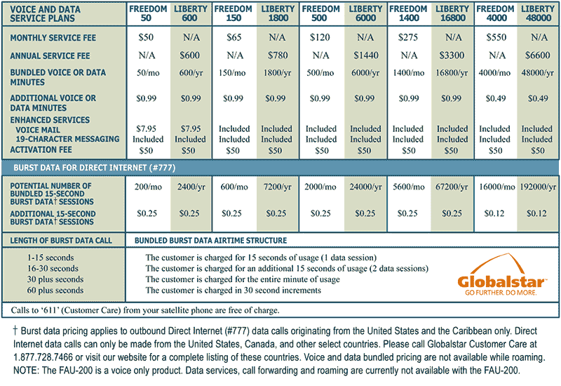 Plans are based on a 12-month contract. Credit approval required. Early de-activation of the contract will result in a cancellation fee. Bundled voice and data minutes are applicable for calls from the U.S. and the Caribbean to the U.S., Canada and Puerto Rico. Voice airtime billing is based on a one-minute minimum and 30-second increments. Calls placed from the U.S. and the Caribbean use standard airtime, no roaming, and no long distance to the U.S., Canada and Puerto Rico. Calls to other Caribbean countries and other destinations will be charged long distance. For roaming rates, please consult the Roaming Calculator at www.globalstar.com. Included minutes do not apply while roaming. International roaming charges apply to all calls placed outside North America. International roaming charges and International long distance charges may vary depending on foreign taxes and tariffs from individual countries. Please see End User Terms and Conditions for all details concerning subscription to the Globalstar system. All price plans are subject to all U.S. local, provincial and federal taxes. Globalstar reserves the right to modify any price plan without notice. |